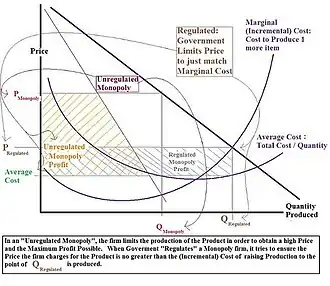 If a government feels it is impractical to have a competitive market, it sometimes tries to regulate the monopoly by controlling the price the monopoly charges for its product.[4][2] The old AT&T monopoly, which existed before the courts ordered its breakup and tried to force competition in the market, had to get government approval to raise its prices.[2] The government examined the monopoly's costs and determined if the monopoly should be allowed to raise its price; if the government felt that the cost did not justify a higher price, it rejected the monopoly's application. Although a regulated monopoly will not have a monopoly profit that is high as it would be in an unregulated situation, it still can have an economic profit that is still above what a competitive firm has in a truly competitive market.[2]