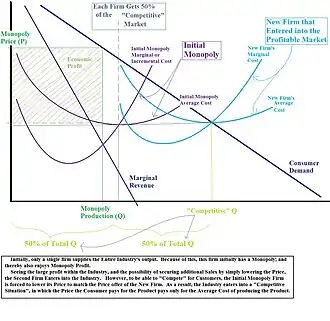 Without barriers to entry and collusion in a market, the existence of a monopoly and monopoly profit cannot persist in the long run.[1][3] Normally, when economic profit exists within an industry, economic agents form new firms in the industry to obtain at least a portion of the existing economic profit.[1][4] As new firms enter the industry, they increase the supply of the product available in the market, and they are forced to charge a lower price to entice consumers to buy the additional supply they are supplying as competition.[1][4][2][3] Since consumers flock toward the lowest price (in search of a bargain), older firms within the industry may lose their existing customers to the new firms entering the industry, and are forced to lower their prices to match the prices set by the new firms.[1][4][3][6] New firms continue to enter the industry until the price of the product is lowered to the point that it is the same as the average economic cost of producing the product, and economic profit disappears.[1][4] When this happens, economic agents outside of the industry find no advantage to entering the industry, supply of the product stops increasing, and the price charged for the product stabilizes.[1][4][2]