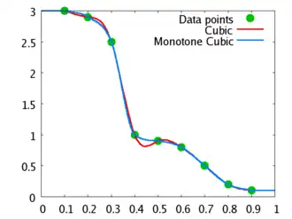 In the mathematical field of numerical analysis, monotone cubic interpolation is a variant of cubic interpolation that preserves monotonicity of the data set being interpolated.