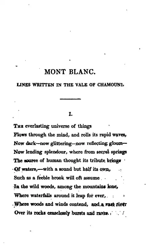 "Mont Blanc" is a 144-line natural ode divided into five stanzas and written in irregular rhyme.[12] It serves as Shelley's response to William Wordsworth's Tintern Abbey and as a "defiant reaction" against the "religious certainties" of Samuel Taylor Coleridge's "Hymn before Sun-rise, in the Vale of Chamouni",[13] which "credits God for the sublime wonders of the landscape".[1]