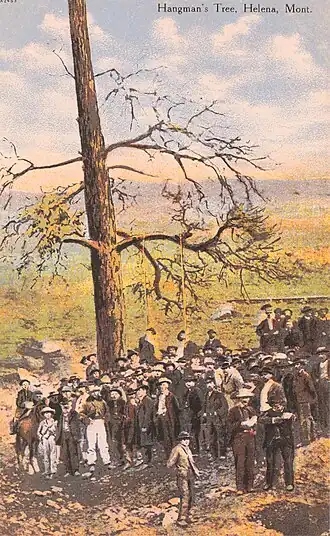 Shortly after Judge Lyman Munson's arrival in Helena, he convened a grand jury on August 12, 1865. However, unlike Judge Hosmer in Alder Gulch, Munson made no remarks about vigilantism nor did he threaten vigilantes with prosecution if they continued their activities. The vigilantes showed little respect for Munson's court and proceeded to carry out at least 14 extrajudicial executions. Among them was that in January 1870 of Chinese worker Ah Chow, who had shot and killed white miner John R. Blitzer after he found Blitzer attempting to rape his wife.[26] No member of Helena's vigilantes was ever indicted by Munson's grand jury for executions carried out by the Helena Committee of Safety. The last execution by the Helena vigilantes occurred on April 27, 1870, when Joseph Wilson and Arthur Compton were hanged from the "Old Hangman's Tree" for the robbery and attempted murder of George Leonard. The double hanging is significant because it was photographed at the time and the image, widely circulated, had the effect of damping public sentiment for vigilantism.[25]