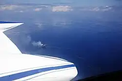 The leak initially emanated from the Montara Wellhead platform on 21 August 2009. The depth of water was approximately 250 ft (76 m) and depth of hole was approximately 1.6 mi (3 km) below the seabed.[23] Sixty-nine workers on the rig were safely evacuated with no injuries or fatalities.[8] By 24 August, the oil slick resulting from the spill was estimated to be 14 km (9 mi) long and 30 m (100 ft) wide.[1] On 29 August, the slick was estimated at 180 km (110 mi) at a minimum, measured east to west.[24]