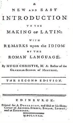 George Gledstanes was master in 1586–7, a teacher of languages and Reader in the parish church.[17] David Lindsay was appointed master around 1594 before becoming master at Dundee Grammar School.[18] He was followed by James Lichton, appointed in 1614.[19] Alexander Petrie, made master in 1622, received a salary of 25 merks per quarter for Candlemass, Lamass, and Hallowmass.[19] Robert Graham became master in August 1638 and remained until 1644. By this time the school was increasing in numbers and an assistant master was employed in 1639.[20] Succeeding Graham were William Clyd (6 May 1643 – 8 November 1643); John Nicol (1643–1645); John Cargill (1645-July 1656) and John Strachan (22 September 1656 – 1659).[21] James Wishart was master from 1659 until his death in 1684. William Langmuir or Langmoor was appointed on 2 January 1684 and was in his post until 1704, when Robert Strachan took over as master.[22] In 1686 a library was established at the Grammar School, which contained a number of rare books.[23] On 28 June 1710 Robert Spence became master, then James Stewart in 1717 and Patrick Renny on 16 June 1725.[24] Hugh Christie, on 10 June 1752, was the first headmaster of the school to be granted the title "rector".[5] His successor David Valentyne was rector from 20 July 1766 until 19 October 1806.[14]
