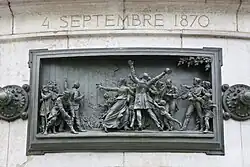 The stone pedestal is surrounded with twelve high reliefs in bronze, made by Léopold Morice.[2] Connected with rosettes and arranged at eye level, they constitute a chronology of events marking the history of the French Republic, between 1789 and 1880 :