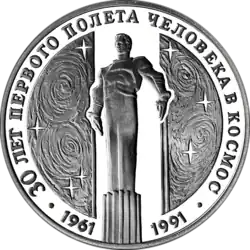 The monument to Yuri Gagarin is depicted on the reverse side of a non-circulating 1 oz silver 3 rouble coin. This coin was minted in 1991 to honor the 30th anniversary of human spaceflight. An image of the monument is depicted on the back side of the coin, along with the words (in Russian) "30 years of human spaceflight".[6]