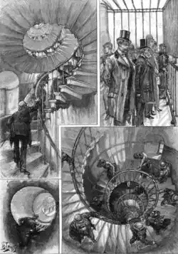 The viewing platform near the top of the Monument is reached by a narrow winding staircase of 311 steps.[a] A mesh cage was added in the mid-19th century to prevent people jumping to the ground, after six people died by suicide there between 1788 and 1842.[5]