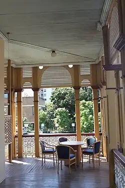 The southeast and northeast elevations, with views of the river, feature verandahs on both levels, an elaborate timber belvedere at the corner, and a projecting gable with bay windows in the front (southeastern) elevation. The verandahs and tower are detailed with double timber posts with shared capitals and timber brackets, a balustrading of fine cast iron, and a timber valance.[1]
