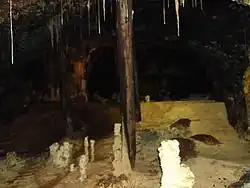 The first recorded mention of the mine dates to 1683, as a source of alum, iron and copper vitriols (sulfates),[1] sulfur, and colored clay. The colours of the stalactites are produced by the minerals in the mine.[2] In 1717 the merchant Johann Leonard Morassi bought the mine and named it Morassina. In 1750 the Leipzig trading firm of Frege bought it and became extremely wealthy from it; in 1816 they were able to buy back the Crown Jewels of Saxony, carried off by Napoleon, from Amsterdam. However, the bottom fell out of the market after chemical methods of synthesizing alum and sulfuric acid were introduced around 1850. The mine was not worked after 1860,[1][3] and was closed up and forgotten. In 1851, miners seeking uranium discovered it and the stalactite formations,[3] but because of its location near the Inner German Border, the East German authorities refused until 1989 to allow it to be opened to visitors. It was finally opened in 1993.[1] There is a mining museum (opened in 1995) and the St. Barbara licensed spa (opened in 1997); radium cures are offered.[4]