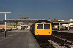 Nationalisation of the UK railway network in 1948 saw British Railways take over control of the station and heralded an era of significant changes. The first of these came in February 1951, when the EMU sets were withdrawn and scrapped, after more than 40 years of service. Steam push-pull sets replaced them, but in 1953 electric working was reinstated, still at 6600 V AC and using the same infrastructure, but this time at a 50 Hz frequency. Three EMU sets built in 1914 and formerly used on the Willesden Junction to Earls Court route in London were brought in to run the service, and a fourth was added in 1957.[3] Another notable change occurred in September 1958, when the former LNWR terminus at Euston Road was closed to regular passenger traffic at the end of the summer timetable.[9] The local services from Lancaster and Carnforth via Bare Lane henceforth followed the same route as the Irish Boat trains into Promenade, leaving Euston Road to be served only during the peak summer season between June and September until 1962. Summer traffic was by this time slowly declining (due to the rise in private car ownership and increasing availability of foreign package holidays), but there were still sufficient numbers visiting Morecambe in 1959 to require more than 20 scheduled and excursion trains to and from Euston Road and a similar number from Promenade.