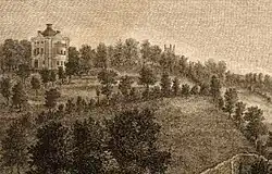 He built the Hall on property which he inherited from his maternal grandmother Merilina Jermyn. It was her share of the Jermyn estate.[7] His Diary records that the foundation stone was laid on 2 April 1773 and that the architect was Adam.[8] Adam block was built as a cube, with a parapet and a wood cornice. The eastern wing was added in the mid nineteenth century.[9] An engraving of part of Bury St Edmunds was made in 1774 immediately after the Hall was built which shows the new Adam structure on the extreme left.[10]