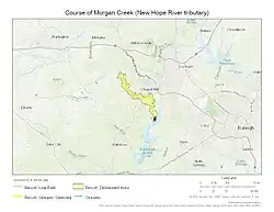 Morgan Creek rises in a pond on the Cane Creek and New Hope Creek divide about 0.5 miles northeast of Dodsons Crossroads, North Carolina. It flows into University Lake in Chapel Hill and then Morgan Creek flows southeast to meet New Hope Creek and forms the New Hope River in the B. Everett Jordan Lake Reservoir in Chatham County.[2]