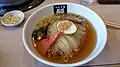 The raengmyon from Hamhung can be separated into two types: bibim-raengmyon, served without broth but mixed with chili paste, and mul-raengmyon, served in a clear broth that typically combines beef broth with dongchimi (radish water kimchi).[19][20][21] While the broth is different, the strength of Morioka reimen is close to that of Hamhung raengmyon but with thicker noodles.