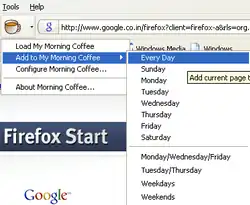 Morning Coffee is a discontinued Firefox addon that assists its Firefox user in opening daily routine websites. Users can configure Morning Coffee with several presets, each of which consists of a collection of URLs. These presets are named after days of the week. Upon order, Morning Coffee can open all URLs within a certain preset in separate tabs. The same effect can be achieved by Firefox bookmarking system, and the ability to open multiple web pages as home pages. However, Morning Coffee can be configured to close all tabs before opening a preset, or randomize the order of the tabs. Morning Coffee's ability to open the correct daily preset instead of home pages remained in the experimental stage.[4][5][6]