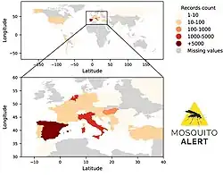 Mosquito Alert is a cooperative citizen science project, currently run as a non-profit and coordinated by four public research centers in Spain.[1] The aim of the project is to study, monitor, and fight the spread of invasive mosquitoes transmitting global diseases such as dengue, Zika, Chikungunya or West Nile fever. The Asian tiger mosquito (Aedes albopictus) and the yellow fever mosquito (Aedes aegypti) are some of the invasive species that Mosquito Alert watches out for.[2] The project provided the first detection of the Asian bush mosquito Aedes japonicus in Spain in 2018, providing the first report of a population of mosquitos that were located 1,300 km from their previously nearest known location in Europe.[3]