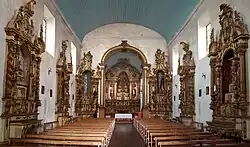 The result of successive interventions still preserves a recognizable general Baroque plan, with Rococo elements in the decoration. Its thick walls and imposing appearance resemble a fortress, which has been interpreted as a reflection of the period of border disputes between the Portuguese and Spanish territories in South America. It has been highly praised for its monumentality and the beauty of its carved decoration, which some authors attribute to Francisco da Costa Senne.[5][7] According to Mariza Lópes, the high altar, whose style differs from the others, is by Bartolomeu Teixeira Guimarães.[7] Marcia Bonnet says that it resembles - in structure, distribution of elements, and ornamental motifs - several other altarpieces located in different villages of the Captaincy of São Vicente, but does not identify an author.[10]