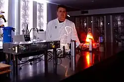 In 2005, Cantu began experimenting with liquid nitrogen to flash-freeze food, and helium and superconductors in an attempt to levitate them. He purchased a class IV laser (the highest grade available) to cook the interior of fish while leaving the outside raw, and create "inside out bread" with a doughy exterior and crusty interior.[3] Later dishes include the "Donut Soup" (an espresso designed to taste like Krispy Kreme doughnut filling) and a sweetbreads and cheese grits dish served with goat-cheese "snow".[2] The 2008 Frommer's guide said Moto's menu was designed to take "dining beyond just eating" with interactive dishes through innovation such as the use of specially designed corkscrew-handled spoons stuffed with herbs to provide aroma as you eat. It also mentioned Cantu's sense of humor in adding smoky aromas to a raw food course.[11]