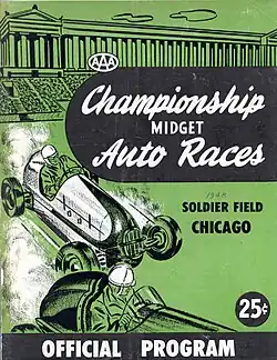 After World War II, the stadium's track became a "hotbed" for midget racing.[6] In 1946, the Chicago Auto Racing Association began hosting regular midget automobile races at the stadium.[6] In 1948, Prince Bertil, Duke of Halland, a member of the Swedish royal family, drove a midget car around the track for fun while in Chicago on an official visit.[23][24] July 23, 1954, the stadium hosted the midget auto racing 100 Lap National Championship. Racers included Tony Bettenhausen, Duke Nalon, Art Cross, Mike Nazurek, Frank Burany, Roy Newman, Gene Hartley, Jimmy Knight, Cal Niday, Johnny Roberts, Jack Bates, among others.[3] A midget racing event the night of July 20, 1957 was one of the earliest at Soldier Field to be televised.[3] On August 14, 1955, the track held a AAA National Midget Car Series race, which was won by Chuck Rodee.[25] On July 23, 1966, Mike McGreevy won the last United States Auto Club midget feature race held at Soldier Field.[6] The final season of midget racing at the stadium, in 1968, saw races hosted by the United Auto Racing Association.[6]