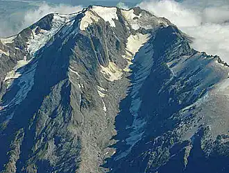 ![]() Mount Adams from the south-east, Escape Glacier at left, Siege Glacier (partially covered in rock debris) at centre. Late summer conditions. | |