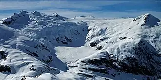 Mount Jimmy Jimmy is a 2,208-metre (7,244 ft) glaciated mountain located in the Coast Mountains in southwestern British Columbia, Canada. It is situated 32 kilometres (20 mi) northwest of Squamish, and 10 km (6 mi) northwest of Ossa Mountain, which is its nearest higher peak. Mt. Jimmy Jimmy is the highest point of the Tzoonie-Clowhom Divide.[2] Precipitation runoff from the peak and meltwater from its immense glaciers drains into tributaries of the Squamish River and Clowhom River. The mountain was named for Chief Jimmy Jimmy (native name Swahsh), a leader of the Squamish Nation, who had traplines in the vicinity of the mountain and was a skilled paddler.[1][3][4] The mountain's name was officially adopted on June 6, 1957, by the Geographical Names Board of Canada.[5]