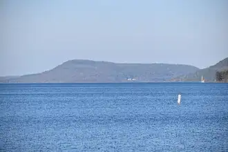 Mount Wellington is a mountain located in the Central New York Region of New York. It is located south of the Hamlet of Springfield Center at the northern end of Otsego Lake. Mount Wellington rises 600 feet (180 m) above lake level. The extreme southern point of the mountain is called Clarke Point and also referred to as the Shad Cam.[2] It is known as "The Sleeping Lion", as it looks similar to a lion laying down, viewed from Cooperstown, New York. It was originally named Mount Millington, but was renamed by George Hyde Clarke in honor of Field Marshal The 1st Duke of Wellington, the victor of Waterloo, who had been Clarke's schoolmate at Eton College in England.[3][4]
