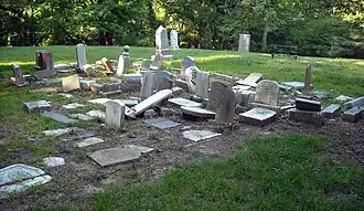 Mount Zion Cemetery/Female Union Band Society Cemetery is a historic cemetery located at 27th Street NW and Mill Road NW in the Georgetown neighborhood of Washington, D.C., in the United States.[2] The cemetery is actually two adjoining burial grounds: the Mount Zion Cemetery and Female Union Band Society Cemetery. Together these cemeteries occupy approximately three and a half acres of land. The property fronts Mill Road NW and overlooks Rock Creek Park to the rear. Mount Zion Cemetery, positioned to the East, is approximately 67,300 square feet in area; the Female Union Band Cemetery, situated to the West, contains approximately 66,500 square feet. Mount Zion Cemetery, founded in 1808 as The Old Methodist Burial Ground, was leased property later sold to Mount Zion United Methodist Church. Although the cemetery buried both White and Black persons since its inception, it served an almost exclusively African American population after 1849. In 1842, the Female Union Band Society purchased the western lot to establish a secular burying ground for African Americans. Both cemeteries were abandoned by 1950.