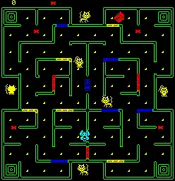The player uses a four-position joystick to maneuver a mouse throughout a maze and eat pieces of cheese scattered along the paths. Six cats patrol the maze and chase the player, with two present at the outset and four more being released one at a time. The maze has three sets of color-coded doors, which the player can open or close by pressing the corresponding buttons in order to block the cats' approach. The player can also escape the cats by entering the "IN" box at the center of the screen, which will teleport the mouse to one of the four corners at random. Contact between the mouse and a cat costs the player one life.