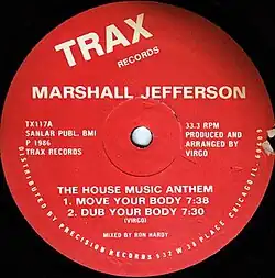 - ^ a b Marshall Jefferson (1986). The House Music Anthem (label). Trax Records. TX117.