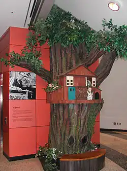 Photograph of the tree house set from Mr. Dressup in the foyer of the Canadian Broadcasting Centre, Toronto.