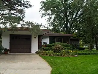 The Robert Reinke House is a single-story house with stucco walls and a low-pitched hip roof with broad, overhanging eaves. The house features a large expanses of windows and a central chimney projecting from the roof. The original house was almost square in plan, but the series of later additions, including an attached garage, family room, screen porch and deck, have made the footprint more irregular. The house is located in a shady lot in a residential cul de sac.[2]