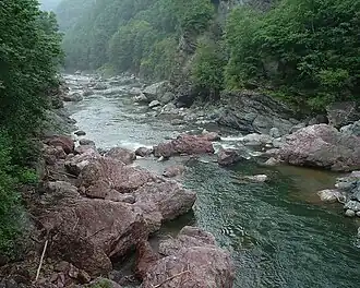 ![]() Red and Blue Boulder Gorge (赤岩青巌峡, Aka-iwa-sei-gan-kyō) in Shimukappu (July 2000) | |