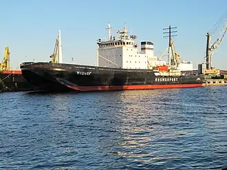 In October 1986,[18] Mudyug was retrofitted with new bow with the intention of improving the vessel's icebreaking capability by a factor of 1.5 without increasing its propulsion power.[19] The icebreaker's traditional wedge-shaped bow was replaced with a so-called Thyssen-Waas bow developed by Thyssen Nordseewerke in cooperation with the Hamburg Ship Model Basin (Hamburgische Schiffbau-Versuchsanstalt; HSVA).[9] The pontoon-shaped bow, which broke ice by shearing instead of traditional bending, had been previously tested in the early 1980s on the 55-metre (180 ft) German icebreaker Max Waldeck.[20]