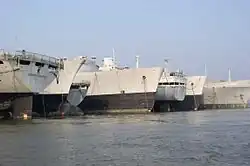 An array of ships part of the National Defense Reserve Fleet are anchored adjacent to Mulberry Island in the middle of the James River. Considered an environmental hazard, the numbers of this reserve fleet are being reduced each year as ships are transported away as scrap. These ships are termed the "Idle Fleet" in local parlance.