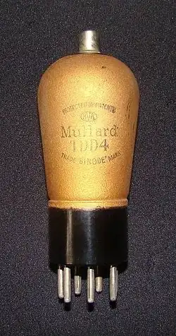 A Mullard TDD4 valve. The gold spray coating served no purpose other than to hide the blackened interior, as Mullard valves were still manufactured using the azide process, long abandoned by other makers.[1]