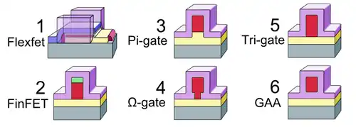 Multi-gate transistors are one of the several strategies being developed by MOS semiconductor manufacturers to create ever-smaller microprocessors and memory cells, colloquially referred to as extending Moore's law (in its narrow, specific version concerning density scaling, exclusive of its careless historical conflation with Dennard scaling).[1] Development efforts into multigate transistors have been reported by the Electrotechnical Laboratory, Toshiba, Grenoble INP, Hitachi, IBM, TSMC, UC Berkeley, Infineon Technologies, Intel, AMD, Samsung Electronics, KAIST, Freescale Semiconductor, and others, and the ITRS predicted correctly that such devices will be the cornerstone of sub-32 nm technologies.[2] The primary roadblock to widespread implementation is manufacturability, as both planar and non-planar designs present significant challenges, especially with respect to lithography and patterning. Other complementary strategies for device scaling include channel strain engineering, silicon-on-insulator-based technologies, and high-κ/metal gate materials.