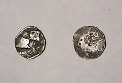 Japanese historian Ginzo Uchida (1872-1919) suggested that the silver coins dated to the Tenmu period, and were likely not officially minted coins made by the government. Instead he theorized that the coins were made by private individuals in Japan using silver produced in Korea.[6] Japanese historian Shinji Nishimura (1879-1943) referred to entries in the 12th year of the Hakuhō period for the silver mining in Tsushima. While he came to the conclusion that the coins may have been used as a type of ornament, the amount of "ornaments" found (100+ pieces) made it difficult to understand. He also suggested that it would be better to think of them as a type of currency.[7] Kanichi Kuroda of the Oriental Numismatic Association argued that Mumonginsen were coin-shaped items with a small circular hole. He then stated that there was no reason for the state to cast such a crude coin when minting them for the first time.[8] Historian Aoyama Reishi stated in his opinion that even if they weren't currency, Mumonginsen must be recognized as transitional circulating coinage. In his reasoning the approximately 100 excavated coins have little variation in weight, and there are too many of them to have been buried as offerings at Shinpo-ji (眞寳院の). (see: "Excavated examples" section below)[9] Japanese archaeologist and professor Keiji Matsumura points out that the remains at the ruins sites (where the coins were found) has generally been either discarded or deliberately buried. Since it's difficult to imagine that something as valuable as silver would have been discarded, he suggests that the undeclared silver coins are biased toward those used as altar implements which wouldn't mean they were numismatic charms.[4]