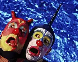 Their early press defined them as horror clowns, a title they appreciated. Turner and Kennard had been horror fans before they had met, and used that genre's techniques to make their clowning more exciting.[6] In their writer's credo of the beliefs which informed their work, the strongest concept was fear, which they've tried to explore throughout their partnership.[7] This visceral excitement is balanced with comedy and naiveté, so that audiences are repeatedly moved from laughter to disgust to sorrow.[8]