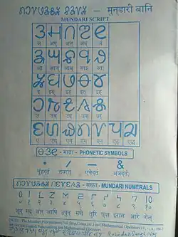 Mundari (Mundari Nagasaki Script) is a Munda language of the Austroasiatic language family spoken by the Munda tribes in eastern Indian states of Jharkhand, Odisha and West Bengal and northern Rangpur Division of Bangladesh.[3] It is closely related to Santali and Bhumij.[4] Mundari Bani, a script specifically to write Mundari, was invented by Rohidas Singh Nag.[5][6] It has also been written in the Devanagari, Odia, Bengali, and Latin writing systems.