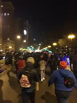A 16-hour sit-in at the Cook County building on December 3, 2015, proceeded after Alvarez refused to resign on December 2.[106] Protests erupted in the Loop after Mayor Emanuel called a special council meeting to apologize for his slow reaction to fix problems within the Chicago police department.[59] On December 24, a month after the video had been published, protests disrupting Christmas-season shopping were again held on Michigan Avenue.[107] Protesters also stood in the alley behind Emanuel's home the last three days in a row in December, promising to continue for 13 more days—to symbolize the 16 shots McDonald took from police—in an effort to force Emanuel to resign.[108] On New Year's Eve, protesters temporarily took over parts of City Hall and a Hyatt hotel lobby, chanting "Rahm gotta go."[109]