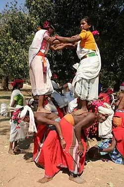 The Muria generally marry late[11] and do not pay dowries.[12] They are not allowed to marry from within their own clan, although a Muria man may marry his cousin. Cousin marriage is common, with Muria men often marrying their mother's brother's daughter or father's sister's daughter.[13]