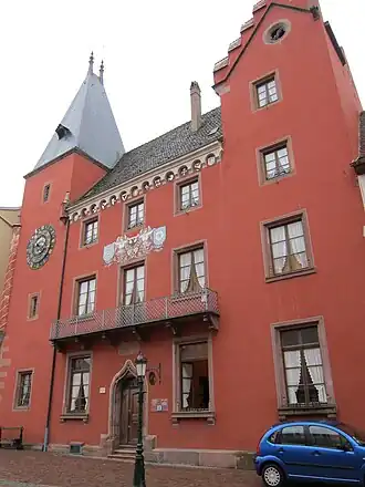 The burgundy facade is of great architectural interest. The arms and the seal of the city, the coat of arms of the Empire and the coats of arms of patricians and notables of the city are symbolized on the facade.