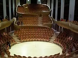 At the back of the museum, in what was originally the assembly hall of the Palazzo dell'Arte, a 464-seat auditorium named after the entrepreneur, Giovanni Arvedi, was designed and built by architects Giorgio Palù, Michele Bianchi, and the acoustical engineer Yasuhisa Toyota. Soloists and chamber orchestras perform on a small elliptical stage with an area of 85 m2, located in the middle of the room.