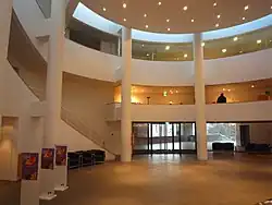 Around the cylindrical entry hall, are the reception counter, library, shop, and cafeteria. Upstairs museum offices, as well as those of the Association of Friends of the Museum, the Association of Museum in Music, which organizes concerts in an auditorium of 275 seats in partnership with The Louvre and finally the André Chastel library equipped with a specialized collection of 55,000 art history books available to consult on site.