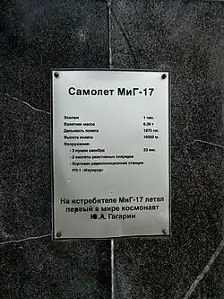 The museum building features a monument in front of it, which is a MiG-17 fighter jet. The plaque on the pedestal identifies it as the same type of aircraft that Yuri Gagarin flew as a cadet, although some sources mistakenly refer to it as a MiG-15[32] or MiG-15bis.[30] According to some sources, the monument was erected in 1963[32] near the college building on Sovetskaya Street, 1. It was later moved to its current location after being taken under protection by the Council of Ministers of the RSFSR in 1974. Today, it holds the status of a monument of federal significance.[2] In front of the building stands a bust of Ivan Polbin, while behind it there is a memorial to the school's hero graduates with name steles, reconstructed in 2007. Additionally, a memorial plaque to Yuri Gagarin is located on the building.[32]