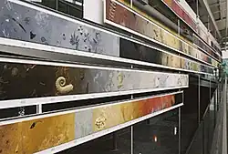 Rock of Ages, Sands of Time is a series of 544 mural paintings by artist Barbara Page. Each of the 544 11✕11" masonite tiles represents 1 million years, encompassing the last 544 million years of history, from the Cambrian Explosion to the present day. Each tile features life-size images of fossils from its respective interval of time, both two-dimensional and in low bas-relief, displayed on a background representing the common rocks and sediments of the time.[4]: 89 The images are based on actual specimens from PRI's collections. The entire mural is approximately 500 feet long and is displayed along a ramp leading visitors from the lobby to the lower-level exhibits.[10] A book contains reproductions of each painting and describes their scientific context in detail.[11]