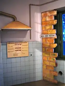 This has 5 cells with exhibitions, in two apartments. Cell 11 contains posters that give orders to and impose restrictions on the population. Cell 12 is the second isolation cell that contains scratched messages from the prisoners. Cell 13 displays newspapers and other memories of the resistance. This display is continued in Cell 14, which also contains the Italian flag raised on the Capitoline Hill in Rome on the day of Liberation.[6] In the second apartment, the one exhibition room records the arrest by the SS of 1259 Jewish citizens from the Roman Ghetto in October 1943.[7]
