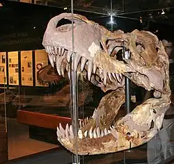 Apart from housing one of the largest collections of dinosaur fossils in the world and the largest in the United States,[14] the museum is also home to one of the world's largest Tyrannosaurus skulls (MOR 008) – narrowly surpassing that of the Chicago Field Museum's specimen, Sue.[15] The museum's Siebel Dinosaur Complex is home to one of the first identified female dinosaurs, an ovulating T. rex.[1] Curator Horner, who served as an adviser to the Jurassic Park films,[14][16] was one of the lead scientists involved in the 2005 discovery of soft tissue remains in the thigh bone of a Tyrannosaurus,[17] which were later brought to the museum. The museum has also been involved in a number of other finds, including a baby Triceratops in Jordan, Montana, in 2006,[18] and "Yoshi's Trike" (MOR 3027), a large Triceratops specimen with 125 cm long horns, discovered in 2010.[19]