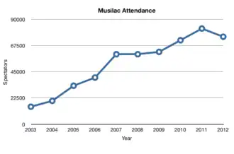 The festival's attendance has steadily increased, with about 75,000 spectators in 2012, compared to 15,000 in 2003. The festival includes multiple genres of music, rather than a specific genre.[3]