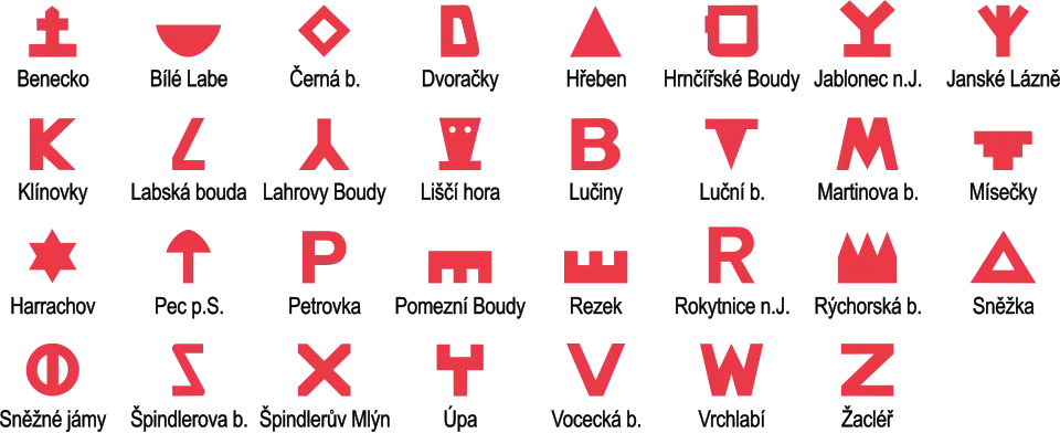 The system is created by the set of blazes, which are cut out of sheet metal and painted red. However, compared to classic blazing systems, they do not mark particular routes or hiking trails. Each sign corresponds to a different object in the mountains, the most frequent being the nearest mountain huts and villages with the possibility of overnighting and catering. The blazes are usually suspended on high poles, which makes them visible even when covered in snow – thus the system can be used by skiers or for winter hiking.
