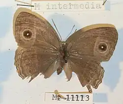 Mycalesis intermedia, the intermediate bushbrown, is a species of satyrine butterfly found in Burma, Cambodia, Thailand, Peninsular Malaysia, Langkawi Island, Indochina, southern Yunnan and India.