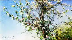 The main theme of the artist's art throughout his career was a Ukrainian landscape, the specific features of nature, the nature of vegetation.[3] Berkos loved to paint during blossoming. Village streets with white houses and lush trees, flowering fields of flax and buckwheat were his favorite motifs: paintings Flax in bloom (1893), Buckwheat in bloom (1894), July. Poppies are blooming (1913), Apple tree in bloom (1919). His sketches Full poppies (1885), The Valley, Flax (1893) noted completeness, reasonableness of the composition, the freshness of colour, special refinement.[3] Particularly noteworthy is a small picture of Berkos from the Kharkiv Art Museum, 47 x 66 cm in size called "Budyaki". The picture, like most of the master’s works, captivates one’s eyes, as much life as there is still to be found in these dried weeds! Following the impressionistic principle that “there should be traces of how it was made in the picture,” the master uses a roundish, dotted, dense brushstroke, which creates a flickering, vibrating surface, where sunlight shines through a hot golden under-shadow through a light-air background. In the Russian Museum of St. Petersburg is a vivid work of nature M. Berkosa "Stream". The size of the painting is 120 by 177 cm, single, oil, year of writing 1889.